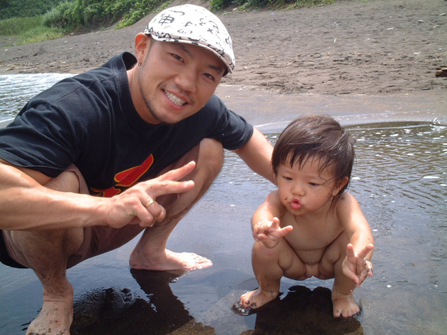娘の芽梨に海デビューさせたかったが毎日雨。しかし、せめて、見るだけでもと思い、連れて行った。 やっぱり大荒れ、遊泳禁止!が、うちの子供は負けない!こんな時ほど、遊ばせないと弱くなる!用意が無いなら、素っ裸だー!!ダブルピースだ!!! |